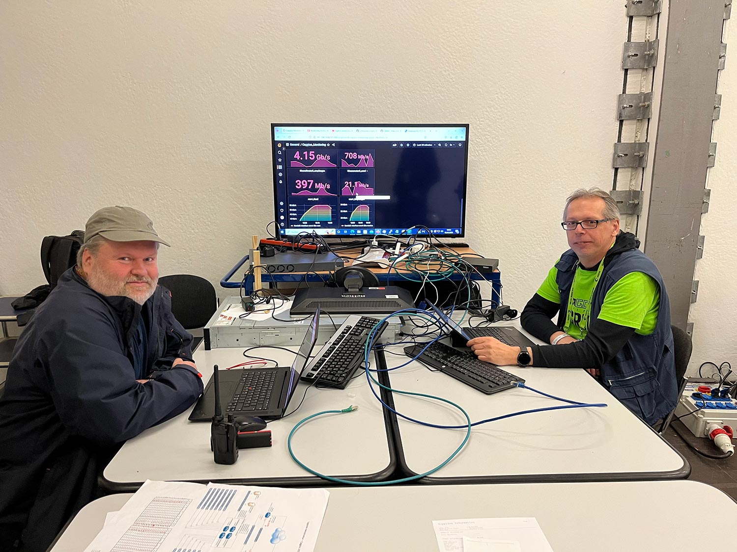 Hierfür war auch die tatkräftige Unterstützung der angehenden Fachinformatiker*innen des BFW Leipzig gefragt. Bereits drei Tage vor dem offiziellen Beginn der Messe rückten die IT-Ausbilder Stephanie Hieke, Stephan Gerlach und Stefan Kusiek mit ca. 52 Umschüler*innen des BFW Leipzig sowie Teilnehmer*innen der Inklusionsgestützten Erstausbildung des BTZ am BFW in Leipzig in den LAN-Bereich ein. Sie bauten Tische auf, verlegten ca. 20 Kilometer Kabel, richteten über 40 Switche ein und legten so den Grundstein für ein ungestörtes Spielvergnügen. Aber nicht nur das vollbrachten unsere angehenden Fachinformatiker*innen. Sie bauten zudem für insgesamt 1.500 Spieler*innen ein Netzwerk und Server auf, konfigurierten diese und standen während der gesamten LAN-Party in einem Drei-Schicht-System als Support zur Verfügung. So konnten die Gamer drei Tage und Nächte ohne Probleme mit- und gegeneinander spielen. Und um nur mal eine paar Zahlen zu nennen: In Spitzenzeiten gab es eine Downloadrate von über 16 Gigabit pro Sekunde und insgesamt wurden 165 TByte Daten bewegt sowie 45 MWh Strom für die PCs und Lüftung verbraucht. Sowas muss gut vorbereitet werden und abgesichert sein. Aber das haben unsere angehenden IT-Fachkräfte mit Bravour gemeistert.
