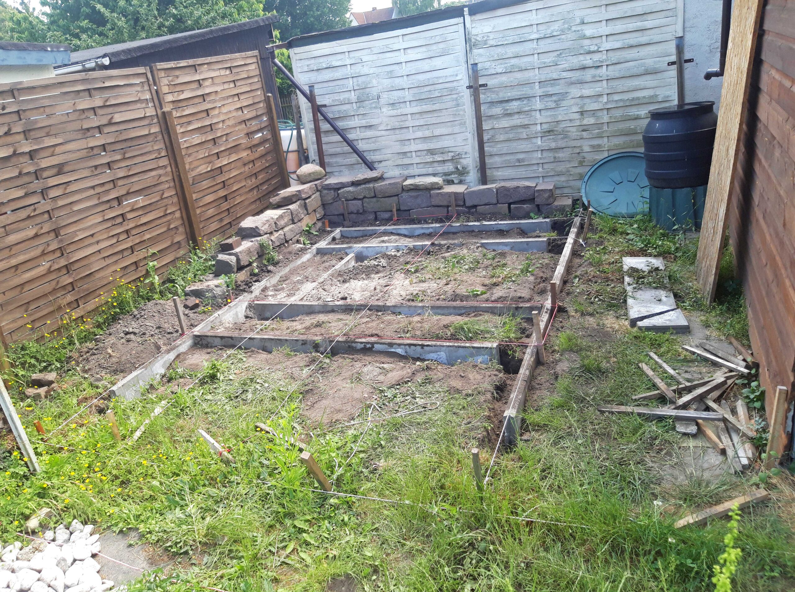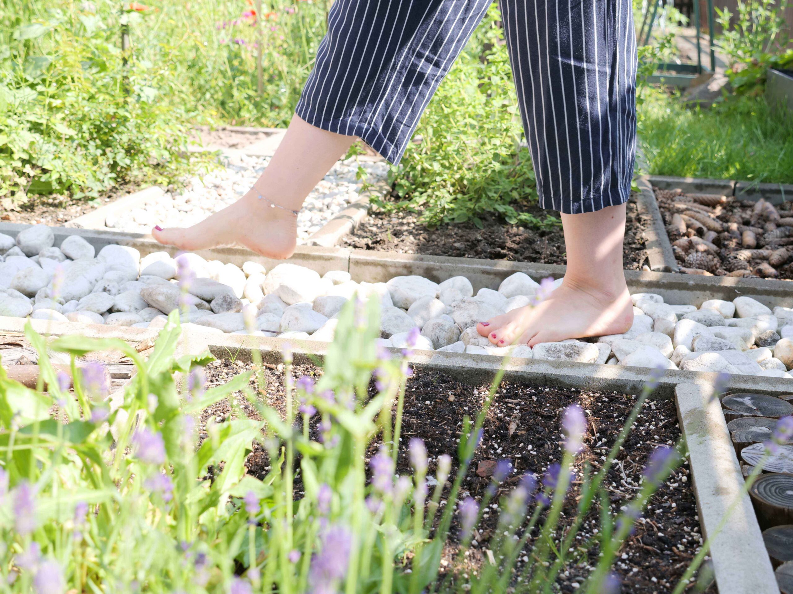 Im Frühjahr 2023 begann der spannende Bau des Sinnespfads. Zunächst wurde die Brachfläche auf dem Gartengelände freigeräumt, und der Verlauf der Wege wurde mit Seilen markiert. Während der Familienheimfahrt im Sommer 2023 legten unsere Trainer Andreas Müller und Mary Osag sowie Ergotherapeutin Liona Graw die Wegborden zur Abgrenzung der einzelnen Barfußfelder.