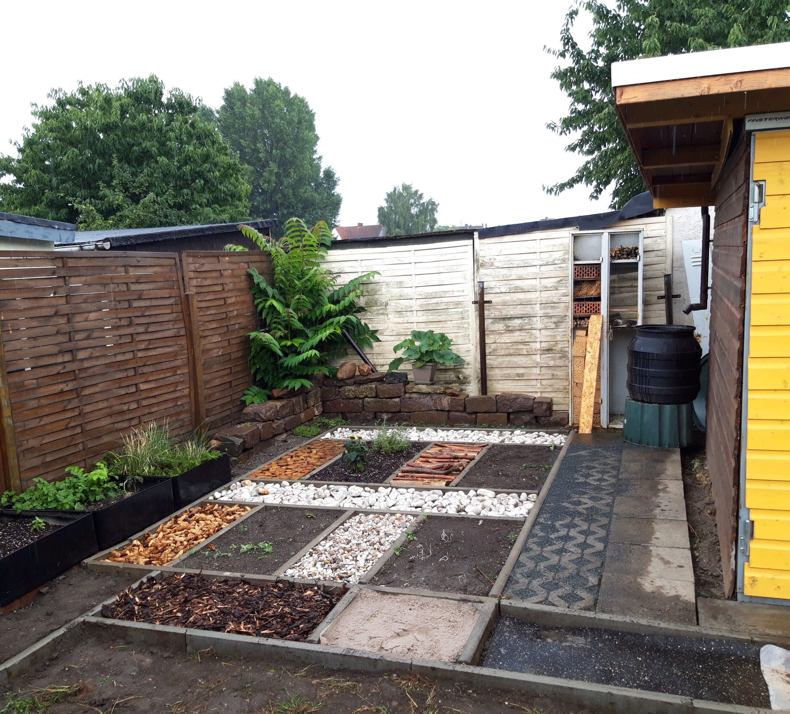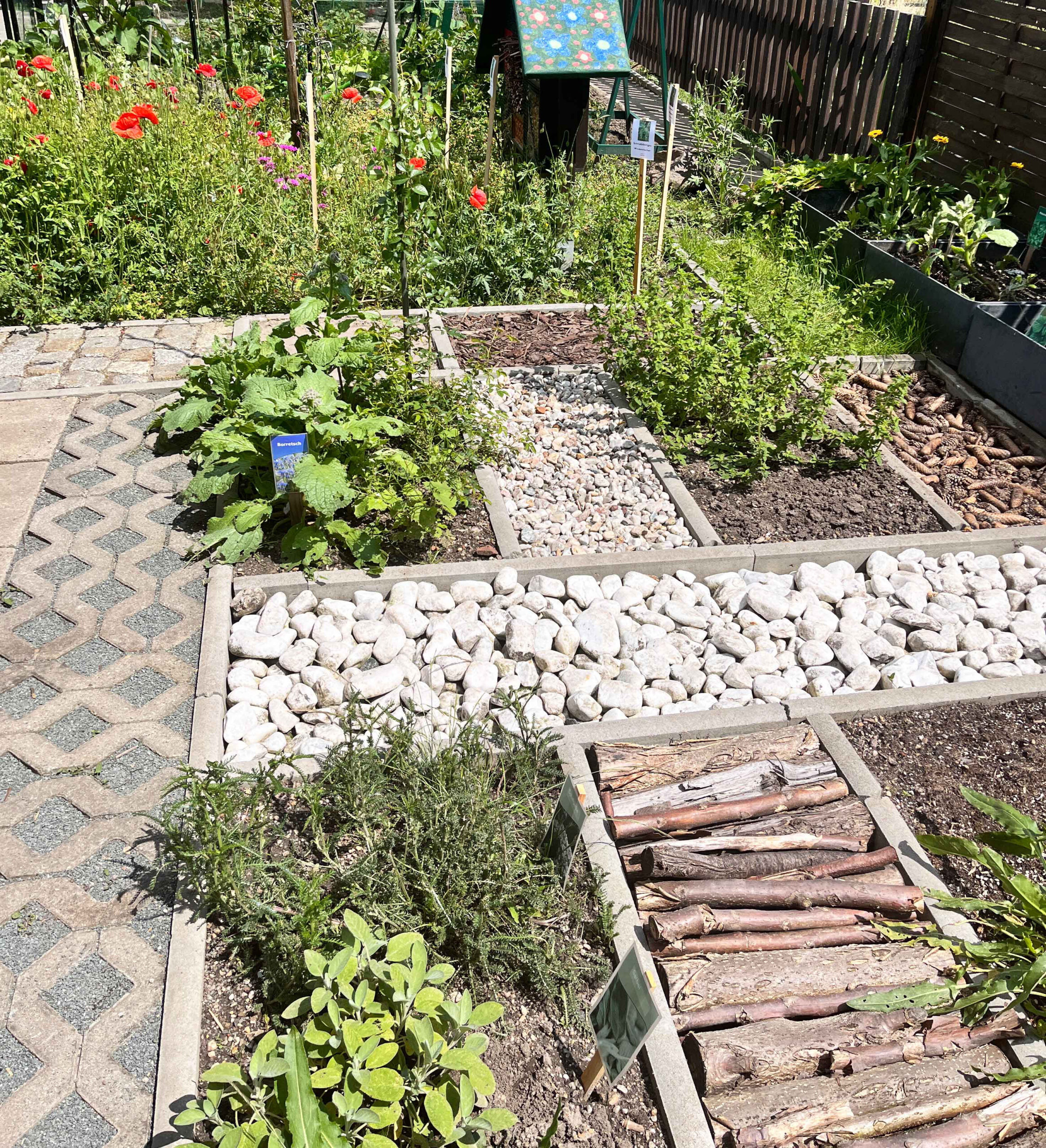 Im Laufe des Unterrichts wurden die Felder nach und nach mit einer Vielzahl von Materialien wie Mulch, Sand, kleinen Hölzern, Gras und unterschiedlichen Steinen befüllt. Zudem wurden sorgfältig ausgewählte Pflanzen eingesetzt, wobei der Fokus auf heimischen Wildkräutern und Pflanzen lag, die durch ihre interessante Haptik, ihren Duft oder Geschmack bestechen.