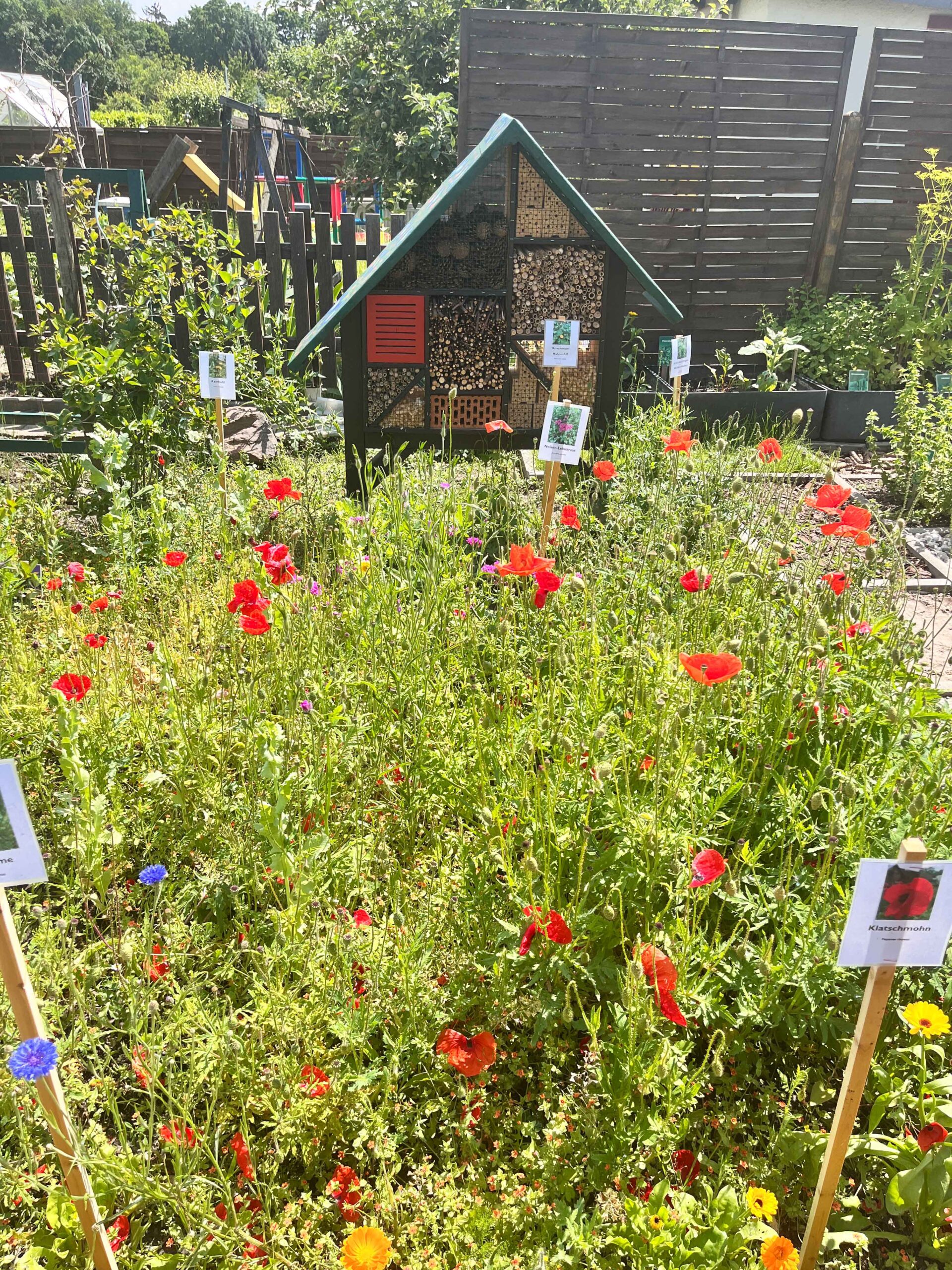 Neben dem Sinnespfad entstanden in Zusammenarbeit mit den Teilnehmenden aus verschiedenen BTZ-Maßnahmen auch eine Trockenmauer, ein Insektenhotel, eine Sitzbank aus Holz, ein buntes Wandgraffiti und ein grünes Klassenzimmer.